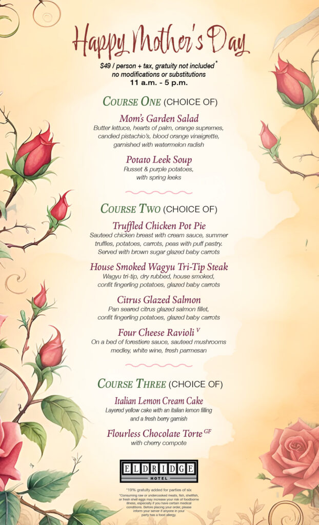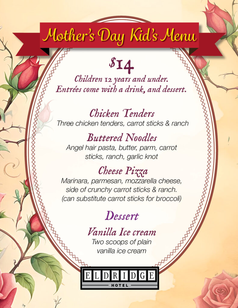 Make this Mother’s Day unforgettable for your Mom! Join us at The Historic Eldridge on Sunday, May 10th, from 11 a.m. to 5 p.m. Treat your Mom to a day of quality time and delicious dining. Reserve your table now at 785-838-5503 or make online reservations below . Let’s celebrate all the love and sacrifices our Mothers have made for us.